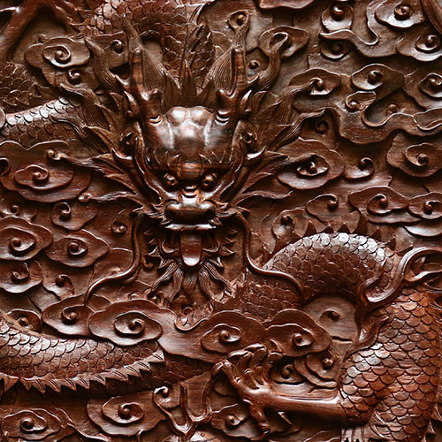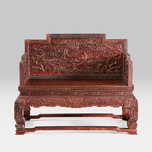 此寶座選用珍貴的大紅酸枝作為原材料,搭腦呈平頭狀,靠背中間高,向兩邊扶手遞減呈梯形。結(jié)構(gòu)設(shè)計(jì)巧妙,對稱布局,每個(gè)面板皆雕著一條騰飛的金龍,刀法精密,圓潤渾厚;龍紋栩栩如生,云紋舒卷生動,龍的姿態(tài)各異,有的昂首前瞻,有的回首瞭望,動感十足。座面嵌裝硬板,束腰內(nèi)收,雕有纏連枝紋,四條三彎腿做同樣的獸首,足下踩有豐碩的地平,端莊穩(wěn)重。